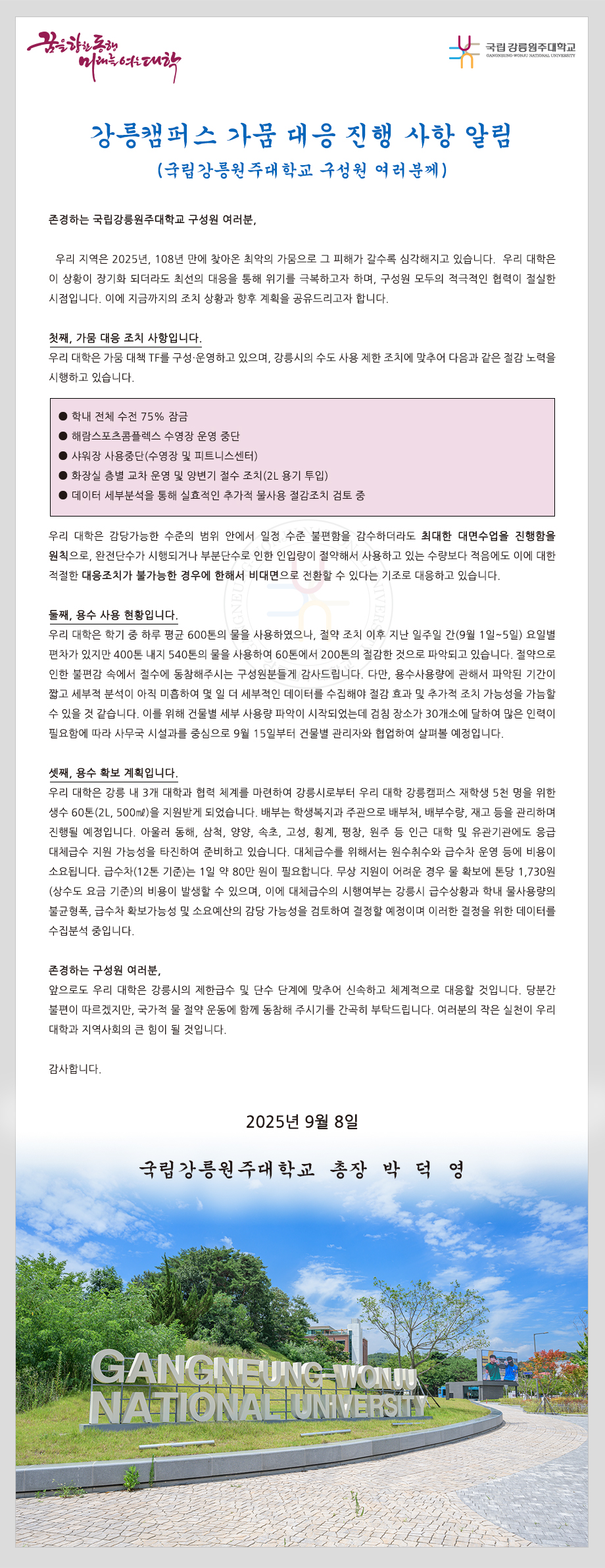 [기타안내] 강릉캠퍼스 가뭄 대응 진행 사항 알림(서한문 25.9.8.)