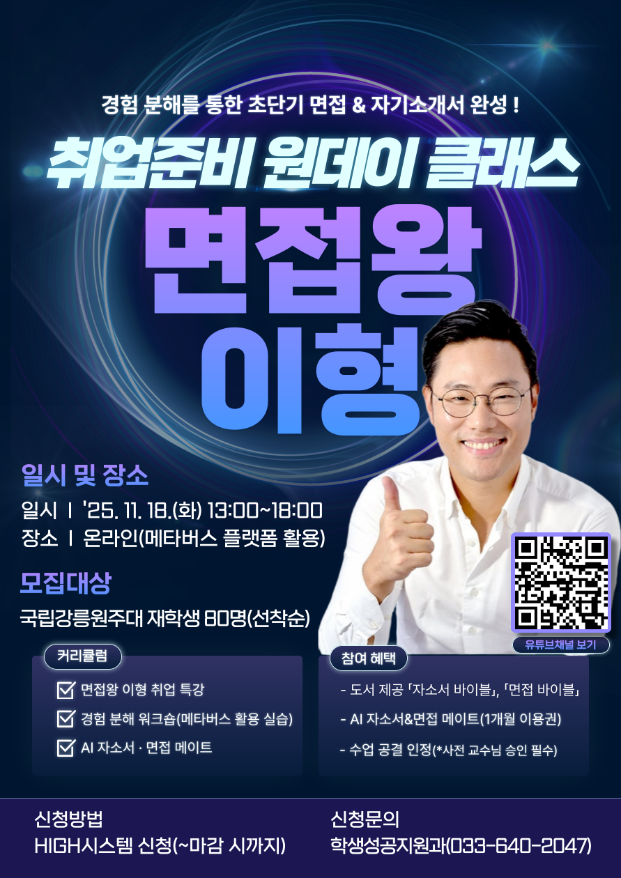 - 1부(13:00~14:00) : 취업 분야 유명 유튜버 면접왕 이형의 취업 준비 전략 특강(합격 사례 분석 및 면접 준비 프로세스 등)